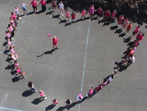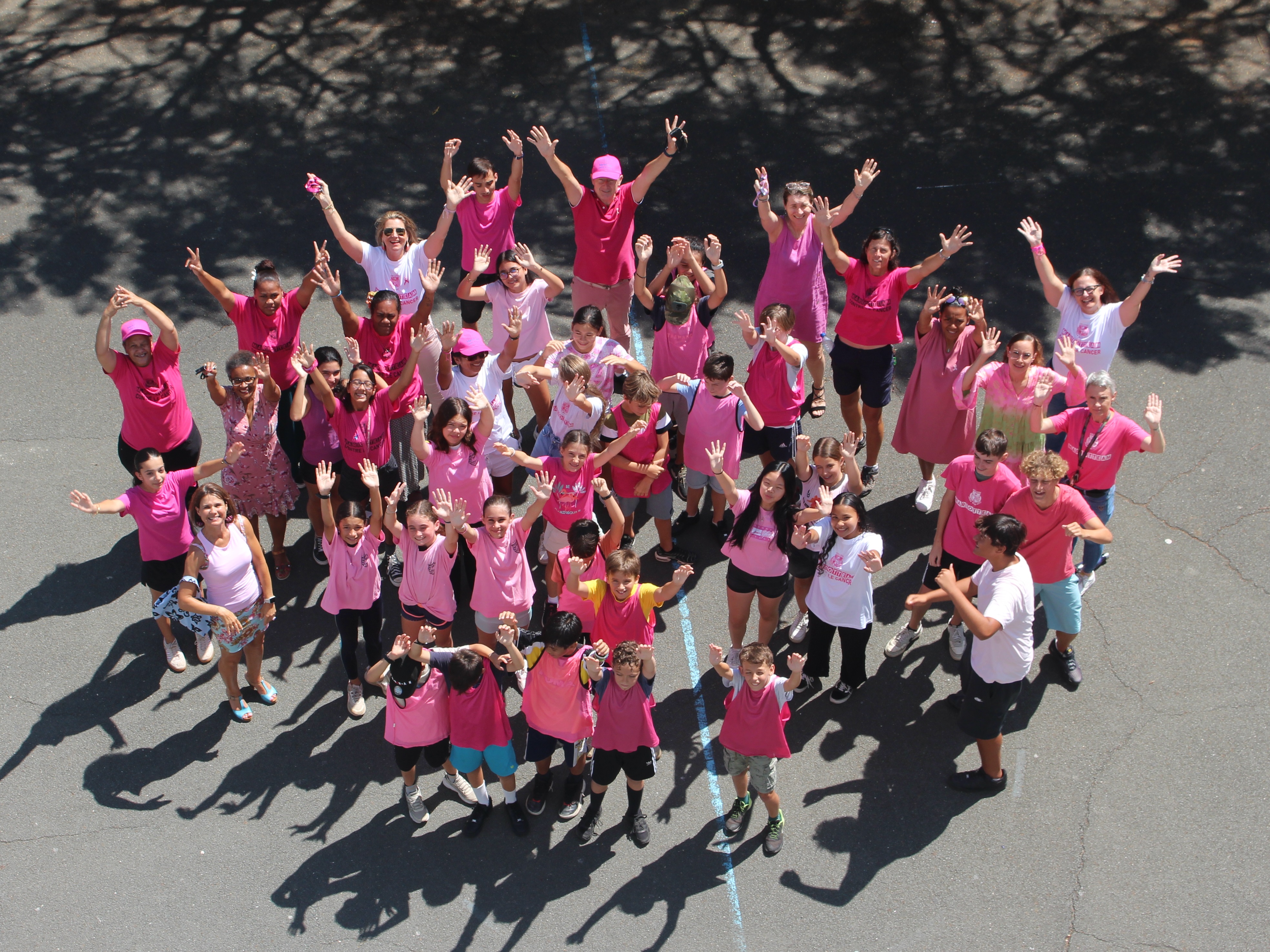 Dans le cadre d’Octobre Rose, mois dédié à la sensibilisation au dépistage du cancer du sein, élèves, professeurs et personnels se sont rassemblés pour une photo de groupe en forme de cœur, tous vêtus de tee-shirts roses.